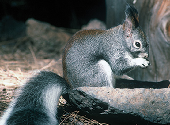 Tassel-eared (Abert’s) squirrels have but one breeding season a year, which is closely correlated with the production of the staminate flowers of ponderosa pine in late April, May, or early June. After a lengthy chase, the female comes into estrus for only one day. She will later give birth to a single litter of from two to four young in a nest made of pine boughs. Throughout the summer, the squirrels feed on the seeds of developing cones as well as on underground fungi or truffles that grow under mature pine trees. These foods are the most nutritious for the squirrel, and only when they are exhausted does the animal resort to feeding on the inner bark of pine twigs-the discarded terminals of which are often seen littering the forest floor.