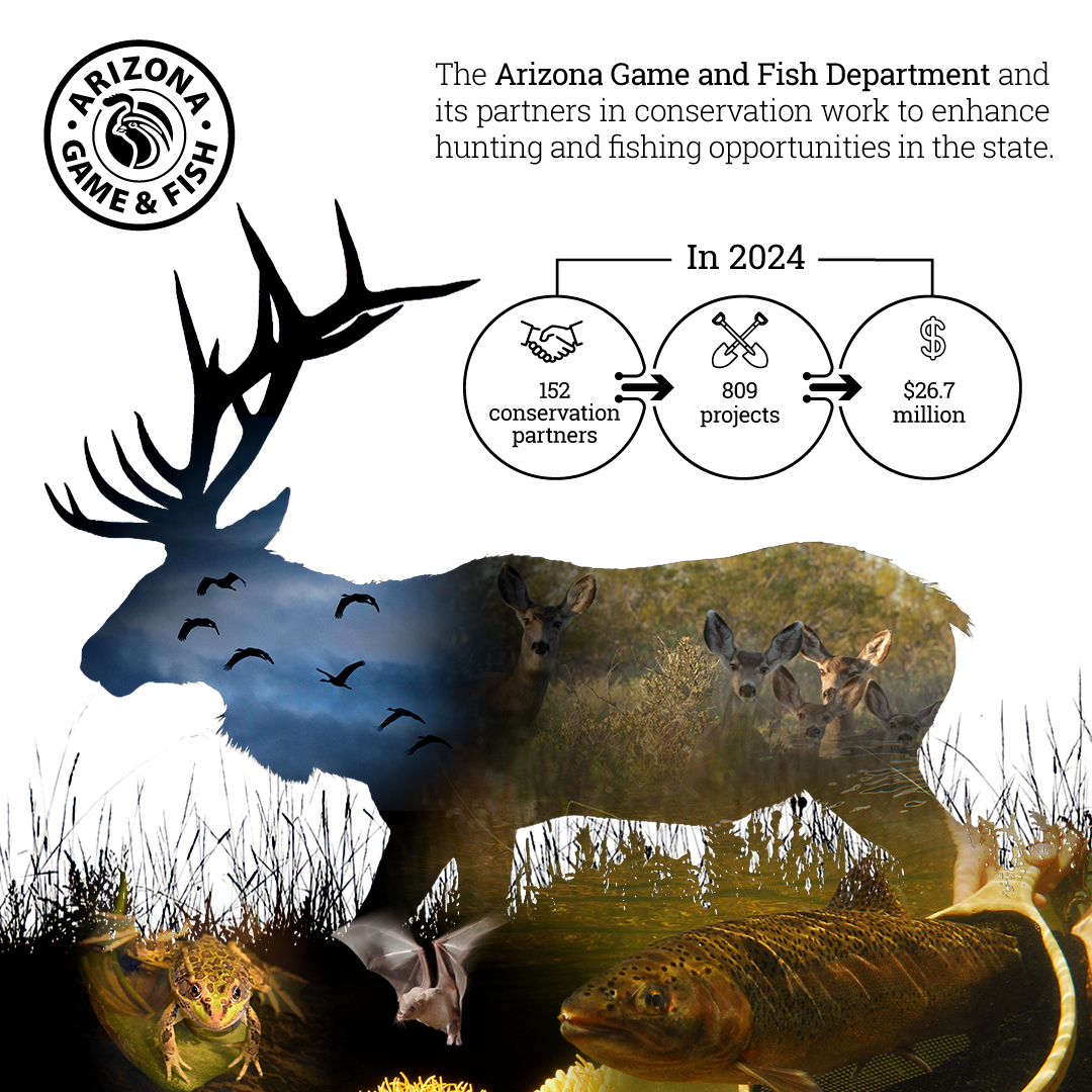 In 2024, the Arizona Game and Fish Department and Arizona’s wildlife conservation organizations put a combined total of $26.7 million on the ground for terrestrial and aquatic wildlife conservation. What’s equally impressive, is the 152 partners that had a hand in 809 distinct efforts. This does not include efforts from any land management agencies or other conservation groups that were unable to report. The table below summarizes the contributions.