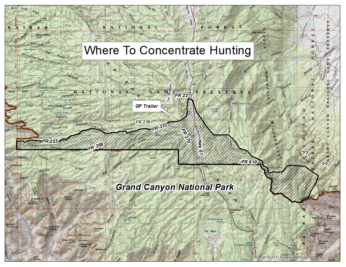 Hunter access to the southern end of GMU 12A south of Jacob Lake on Highway 67 is normally available till the middle of November or until snow accumulation closes it heading into winter. Hwy 67 officially re-opens May 15 annually when Grand Canyon National Park re-opens. When Hwy 67 is closed to access, the Kaibab National Forest is open and can be used to access the bison hunt areas in southern GMU 12A. During this time, best access is via Forest Road 22 south of Fredonia. Additionally, Hwy 67 is accessible via some forest roads around the closure at Jacob Lake. Many bison and turkey hunters use Hwy 67 when it is closed without incident, but be aware when it is closed you can be cited for being on it.