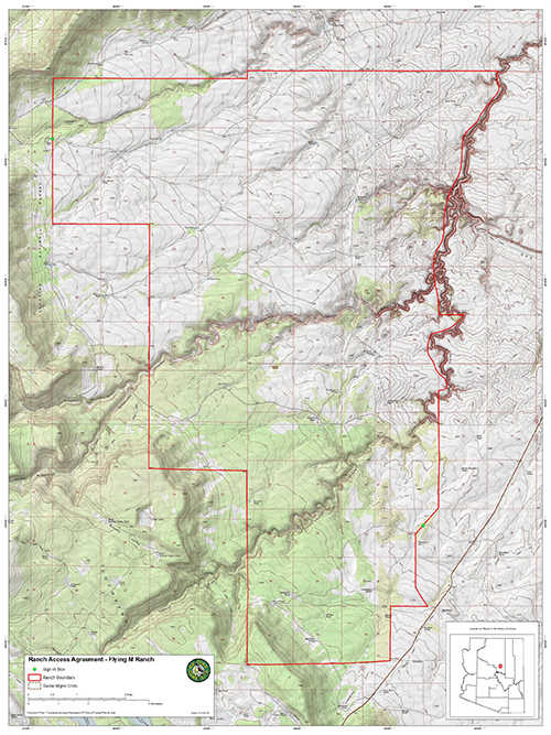 Recreational Users must have in their possession a valid Ranch Access Pass and copy of, or ability to demonstrate knowledge of, Ranch Rules. In addition Recreational Users are required to have in their possession either a valid hunting license (and be scouting for or in persuit of legal game) or a valid State Land Department Recreation Permit when recreating on State Trust Lands. Flying M Ranch Access Passes may be obtained from sign in boxes located at the Forest Service boundary on FS Road 126 (Section 9, Township 18N., Range 11E.)or where the Melbourne Road crosses onto the Flying M Ranch from the Bar T Bar Ranch (Section 22, Township 17N., Range 12E). Arizona State Trust Land Recreational Use Permits may be obtained at: https://land.az.gov/natural-resources/recreational-permits.