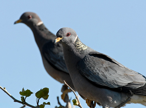 Band-tailed pigeons live in mixed conifer forests, ponderosa pine forests, or in dense stands of evergreen oaks and pines between 4,500 and 9,100 feet elevation. They are about the size of a domestic pigeon, and adults weigh about 8 ounces. Both sexes have an overall blue-gray appearance, and it is only after close inspection that one notices the male’s rosier breast and more iridescence on the nape of the neck.