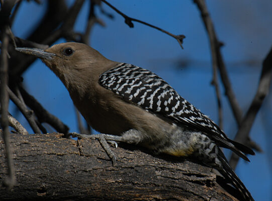 Many woodpecker species live in Arizona. Each can be identified by its markings. Signs of woodpecker presence include sounds, such as drumming, drilling and calls, plus holes in trees, cacti, utility poles and buildings. The drumming is a rhythmic pecking sequence used to make the birds’ presence known. It establishes territories and attracts or signals mates. Woodpeckers can be found throughout the state.
